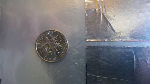 2. cinta abajo del dieléctrico en la parte superior la placa de condensador inferior como se muestra. Deje que el dieléctrico completamente cubrir 2 lados de la placa de condensador inferior (con un margen para evitar formación de arcos) y dejar un lado de la placa expuesta. Esta área desnuda le da un lugar para fijar el boquete de chispa. En el lado restante, dejar un pequeño borde de hoja descubierto para darle un lugar para conectar la fuente de alimentación. Alternativamente, podría cubrir 3 lados y clip su poder en el mismo lado que el boquete de chispa.