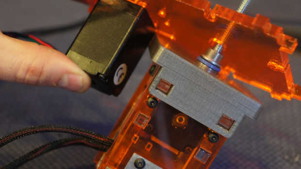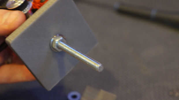 Retire la tuerca de 1/4" de la torre del eje Y. Dejar el 1/4" de empuje cojinete adjunto. Ahora coloque el cojinete de bolas de empuje (BOM #20) y el 1/4" casquillo hacia abajo (BOM Nº 4). Tomar el eje Y todo ahora e inserte en el láser superior corte panel como se ve. Move'in largo ahora!