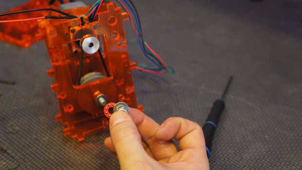 Obtener la sección de corte medio del laser e Inserte el buje de empuje (BOM #3) para que quede hacia arriba. (Esta es la dirección opuesta del otro buje). Lugar el 1/4" seguido por el acero inoxidable 1/4" se lava del cojinete de empuje viene con el cojinete pack de empuje. Por último suavemente inserte los paneles laterales de corte láser en la parte superior e inferior paneles de corte láser, luego coloque la tuerca de bloqueo (BOM #21) en el extremo del perno. No apriete demasiado esto.