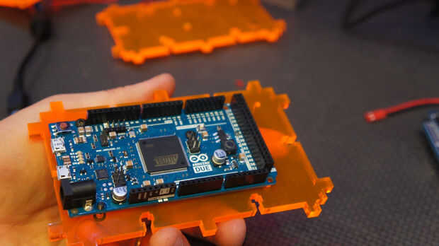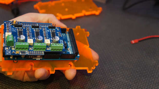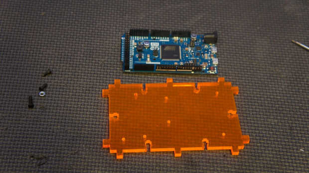 A continuación haz el pequeño M3 x tornillos de montaje de 12mm (BOM Nº 36) y adjuntar la debida de Arduino (Mat 24) al fondo láser corte panel. No apriete esto! Dañará su debida si lo haces!