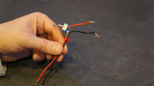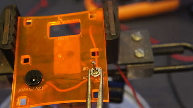 Utilizando un alambre de chatarra conseguir el interruptor basculante (BOM #22) y utilizando un soldador de la soldadura de los cables de chatarra como se ve en la primera imagen de este paso. Insertar próximo montaje poder femenino (BOM #23) en la parte trasera panel de corte del laser, asegurar la tuerca que viene con la montura. Luego soldar el alambre de desecho para ver como la imagen 2 en este paso.