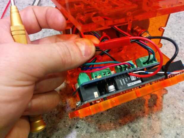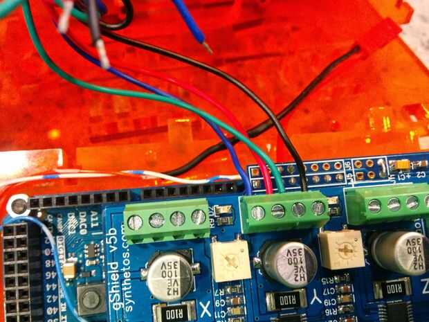 Obtener el eje Y motor hilos que salen de la parte impresa 3d alambre guía. Inserte el negro, verde, rojo, cable azul como se muestra en la imagen de arriba. Usted necesita para asegurarse de que usted utilice esta secuencia de color. Si usted utiliza algunos otros con motores que no comparten el mismo esquema que tienes que probar esto para asegurarse de que su conexión de la polaridad correcta. (Véase la sección tuning / solución de problemas)