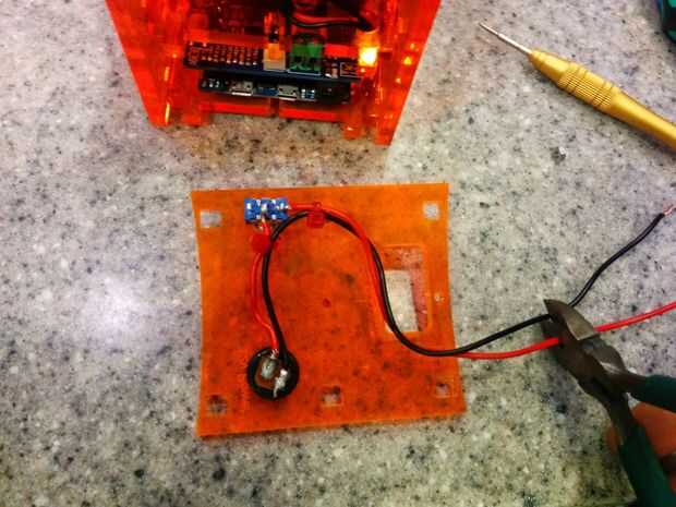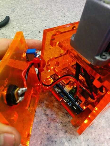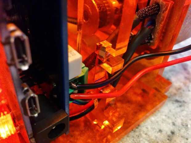Si tienes exceso de cable para el conector de alimentación / conmutador adelante y recorte por ahora. Luego inserte el cable negro en la toma de tierra terminal (izquierda en fotos) y el tornillo hacia abajo. Llevan el mismo con el rojo insertar en el + terminal en la gShield.