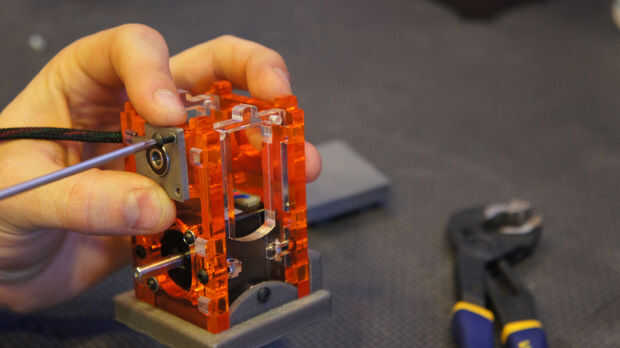 Ahora inserte el abierto soporte de cojinete de eje de Y en el láser de corte Y eje lateral que sobresale desde el eje del motor. La orientación en la ranura del soporte de cojinete Y de la mente. Sujete firmemente con M3 x 8mm pernos (BOM Nº 4). No sobre apriete! Hacer exactamente lo mismo con el soporte de cojinete cerrado Y.