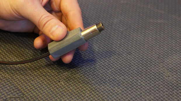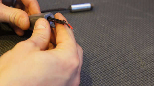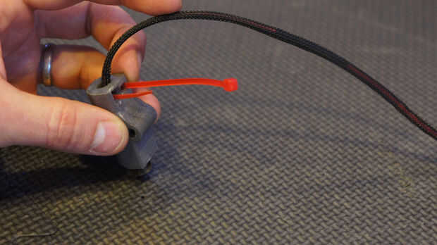 Ubicar el 1/8" acoplamiento protector de cable (esto es opcional pero recomendado BOM #8) Deslice el acoplamiento en el cable para el diodo de láser de 5MW 402nm (BOM #27). A continuación inserte la malla + laser en el soporte impreso 3d láser titular. Tire de los cables de la parte posterior del soporte de impresión láser 3d. Finalmente Inserte una pequeña atadura (BOM #15) en la parte. Puede "doblar" la punta de la amarra a su regreso a la cima. Este es un paso importante. La amarra actúa como un alivio de tensión para el módulo de láser. Sin esta parte el láser módulo voluntad probablemente descanso después de un "tiempo de glowy"!