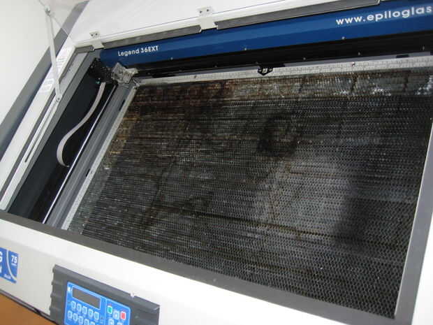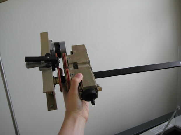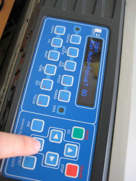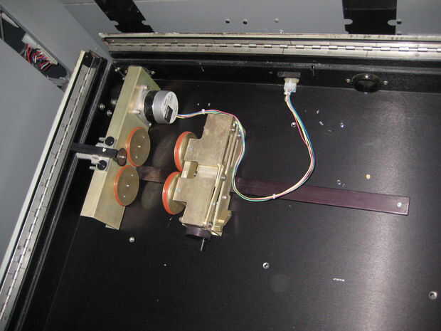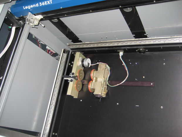 Gire el cortador del laser. Alinee las clavijas del accesorio rotatorio en las clavijas en la parte inferior de la cortadora láser. Enchufe el cable de cinta en el enchufe del lado de lo cortador del laser.