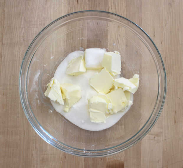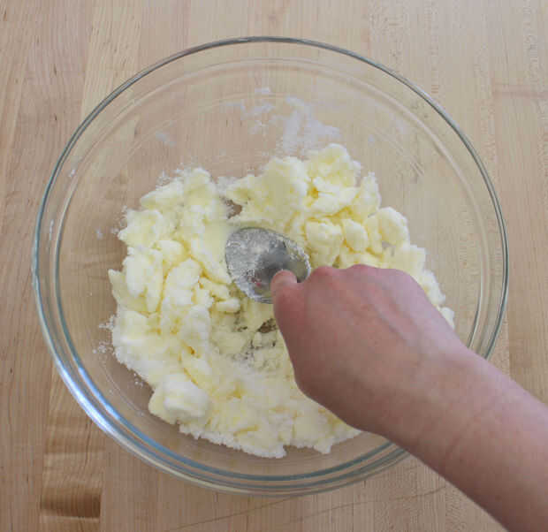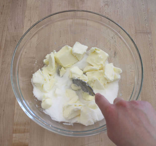 Combinar la mantequilla y el azúcar en un bol y mezclar hasta que quede suave. Idealmente, usted debe usar un mezclador pero una cuchara y codo grasa funciona así.