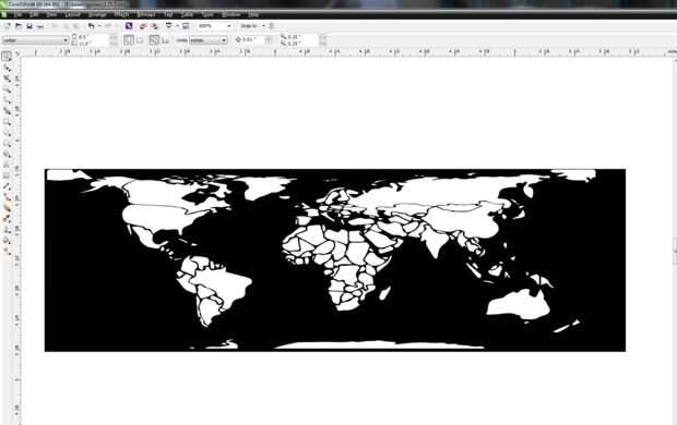 En segundo lugar, la curva del talón desvirtúan cualquier imagen grabada en ella. Como el láser acerca al borde del talón y la pendiente de la superficie está grabada en se vuelve más empinada, la imagen llega a ser alargada. Una manera de lidiar con este estiramiento es distorsionar la imagen que está grabada. Si nos fijamos en la captura de pantalla adjunta, usted verá que la imagen del mapa ha sido aplastada abajo en el extremo norte y sur. Estoy seguro de que hay una manera matemática de contrarrestar la distorsión, pero llegué a esta imagen a través de ensayo y error. Otra manera de tratar con el estiramiento en los polos es dejar un espacio entre la imagen y el borde del talón.
