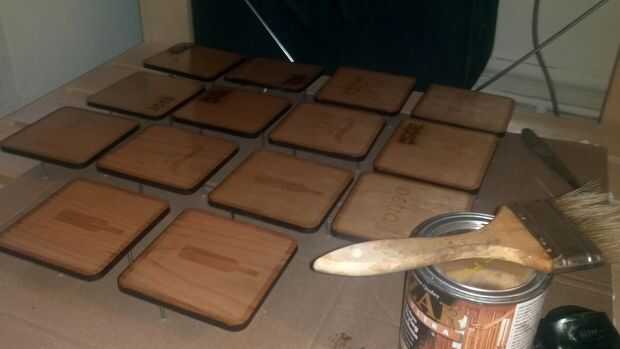 Siga las instrucciones de tu mancha (opcional) y sellador. Hice dos capas con el poliuretano con un ligero lijado entre. He utilizado una hoja de cartón con una malla de clavos en él para sostener el posavasos y permitir que ambos lados de la capa cada vez.