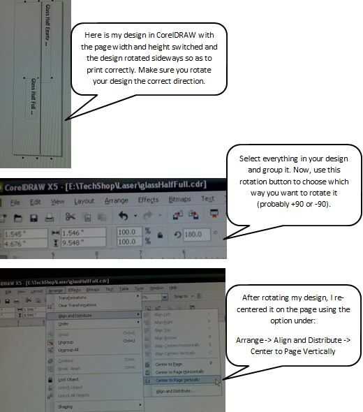 En CorelDRAW, Adobe Illustrator o algún otro programa que pueda comunicarse con el láser vas a utilizar, usted puede diseñar lo que quieras grabar en el vidrio. (Decidí grabar "Vaso mitad vacío..." en la mitad superior de un lado y "Vaso mitad lleno..." en la parte inferior de la mitad del otro lado). Usted tendrá que medir la circunferencia y altura el vidrio a la medida de su grabado. No olvide girar usted diseño después de que termines por lo que se imprime la forma correcta.