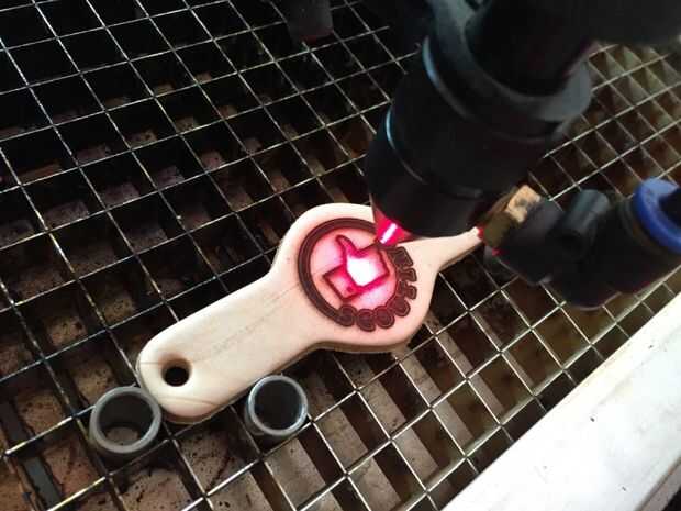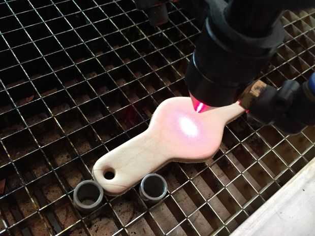 El diseño en el equipo es descargado en la máquina de grabado láser y se selecciona el archivo correcto. Generalmente hago una carrera de 'framing' primero para asegurarse de que todo esté alineado como debe ser. Una vez que todo está listo para funcionar, la bomba de aire está encendida que envía un flujo de aire en el cabezal del láser combatiendo la acumulación humo encima de la lente del láser. La tapa está cerrada y el láser a ejecutar. Un diseño típico woggle toma entre 50 y 60 segundos para grabar.