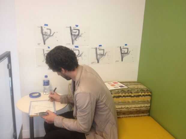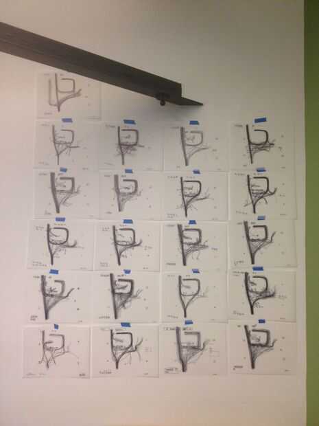 - Este conjunto particular de dibujos coincide con un proyecto más grande que estamos haciendo de Autodesk, una serie de grabados y una escultura. Como siempre hacemos con una nueva pieza, buscamos inspiración de sitio para responder lo mejor posible. Situado en puerto histórico del Embarcadero, la recepción en el muelle 9 es un lugar bullicioso, lleno de visitantes, las entregas y los miembros del personal. Se encontraron interés en las similitudes entre el sitio y uso, las constantes idas y venidas, la naturaleza siempre animada de comercio. Hemos establecido en un lugar con vistas a la recepción para todo un día, seguimiento y elaboración de trayectorias individuales a través del vestíbulo. Cada 30 minutos, de 8 a 18:30, se capturó una sección del muelle 9. Los movimientos simples crean una serie de 21 dibujos. Estábamos tan interesados en la calidad de línea, hemos creado una serie de impresiones de los dibujos originales.