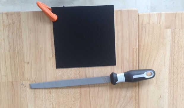 • Use el raspador de metal para biselar el borde de aluminio para sobre un ángulo de 45 grados en todos los lados. Si estás preguntando por qué, sus para no corta el metal a través del papel mojado cuando haces el proceso de impresión.