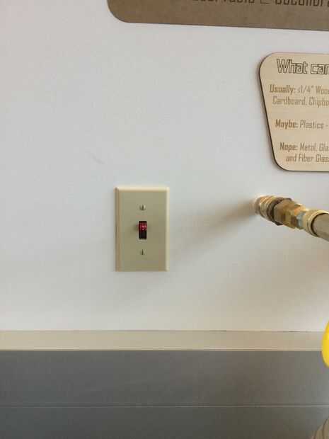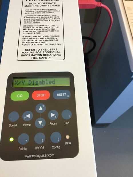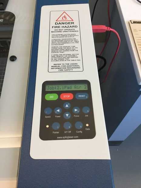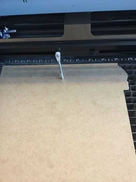 Con la asistencia de personal MakerSpace, encienda el interruptor ventilación detrás del cortador del laser. Asegúrese de que el archivo fue enviado por comprobar la pantalla con el cortador. Abra la tapa y coloque el material de prueba en la esquina superior izquierda de la herramienta de corte. Presione el botón de 'Focus' para subir o bajar la cama para que el dangly poco apenas toque el material. Presione el botón de 'Puntero' y ' X / Y apagado ' botón. Use sus manos para colocar el puntero rojo en la esquina superior izquierda de la máquina. Pulse "Reset", cierre la tapa y presione 'Ir'. Si todo va bien con el material de prueba, coloque el dispositivo en la máquina y golpeó otra vez 'GO'.