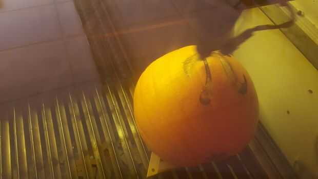 La calabaza en su lugar es difícil la rápida acción del láser puede hacer que se sacuda si no asegurado. Para socorrer la base utilizo un triángulo para una cocina al poner caliente ollas en cuanto a no quemar la superficie, básicamente se trata de 3 piezas de MDF grueso de 1 pulgada cortado y convertido en un triángulo.