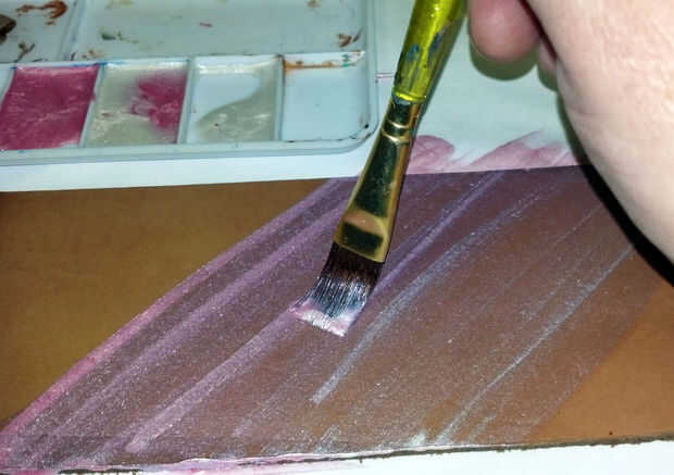 1. en la paleta de pintura añadir tinta blanca perla en un compartimiento, perla rosa en otro compartimiento y una mezcla de los dos colores en otro compartimiento. Cada vez mojar el pincel en la inmersión de tinta en un color diferente. Permitir que los colores de mezcla en el cuero como pinta.