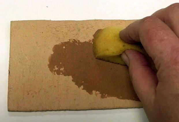 Girar del lado pintado una hoja limpia de papel. Utilice una esponja húmeda para absorber el agua hacia el lado sin pintar ante de su cuero. Usted notará que el cuero consigue más oscuro cuando está mojado. Mojado hasta que esté uniformemente oscuro con agua.