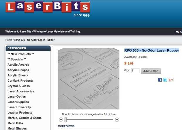 2) una hoja de goma para sellos de goma de corte láser. He utilizado RPO 035 - ninguno-olor de goma láser de Laserbits.com A sola hoja permitida por sobre más de 150 sellos como mina son más bien pequeño - por supuesto depende de la magnitud de su sello de cuánto material se necesita.