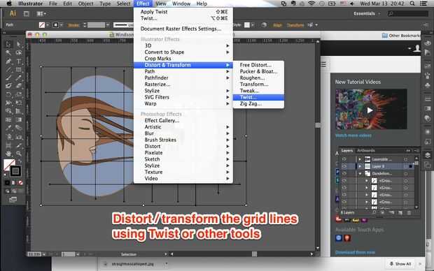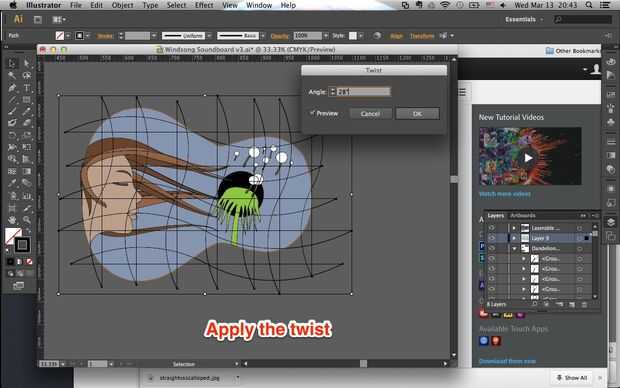 - Seleccione todas las líneas y en el menú efectos, seleccione una de la distorsionar y transformar opciones - se muestra que aquí es el efecto de "giro". Me torcí las líneas hasta que estaba contento con la forma en que veían. En la foto me está haciendo un solo giro, pero para la ilustración final seleccionado grupos de líneas y trenzado en diferentes direcciones