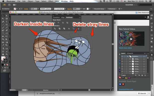 - Utilicé la herramienta Buscatrazos para cortar las líneas extras fuera de la forma de la guitarra. Para ello, primero hice una copia del contorno de la forma de guitarra - se consumirá en el siguiente paso
