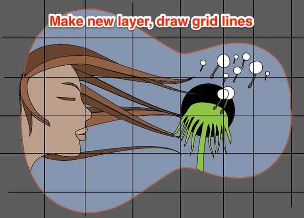 - Hacer una nueva capa por encima de la obra de arte acabada. En la nueva capa dibuje una rejilla de líneas sobre la imagen
