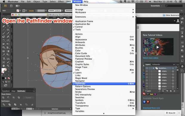 - Una vez satisfecho, abrir la ventana de "Pathfinder", disponible en el menú superior de "Windows"