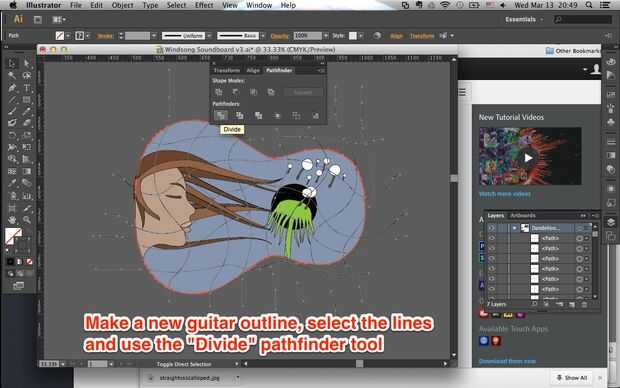 - Seleccione las líneas torcidas y el nuevo esquema de forma de guitarra, luego seleccione "Dividir" en la esquina inferior izquierda de la ventana de Pathfinder.