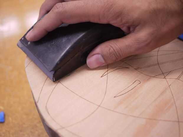 - Arena de la tapa armónica, comience con lija de grano 150, seguido de 220, 320 y lija de grano 400. Utilice un bloque de lijado para mantener el nivel de lijar y siempre lije siguiendo la veta, no contra él.