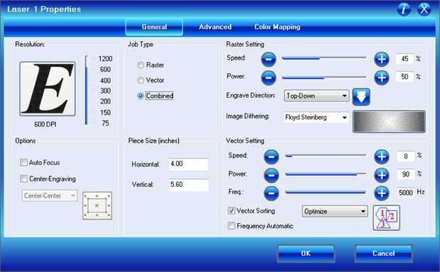 Seleccione tipo de trabajo combinado con el fin de establecer la configuración de la trama y Vector. Cambiar la configuración de resolución a 600 ppp.