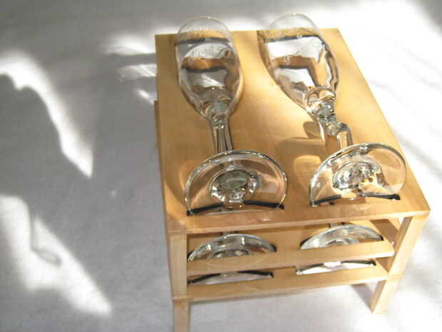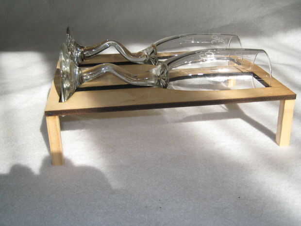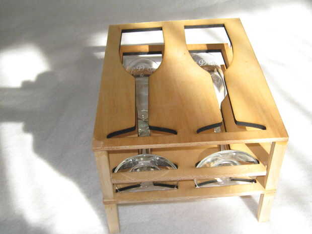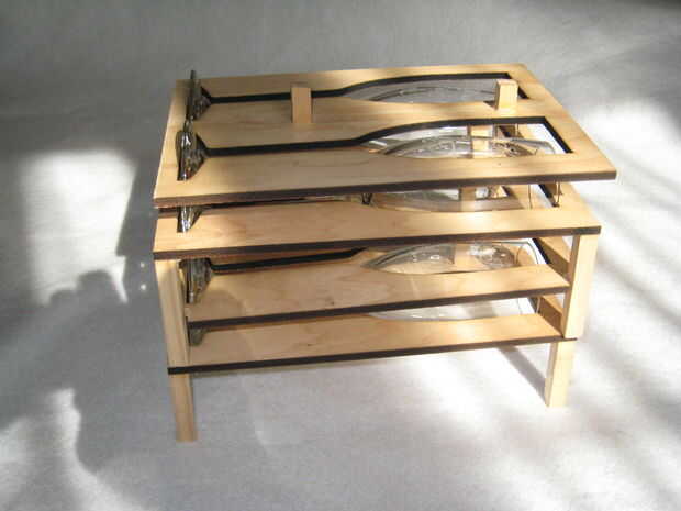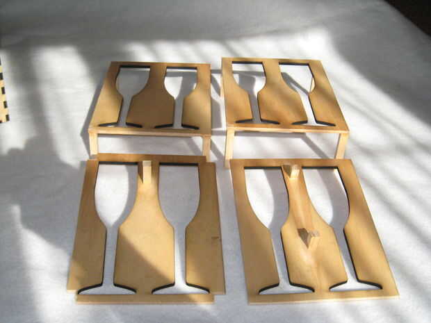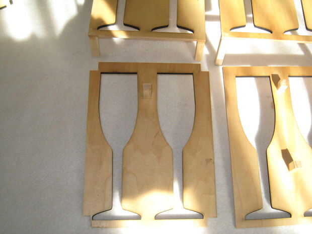 Pegué a dos pequeños estantes"" con separadores en el exterior. Hice entonces el mismo patrón para dos más, pero yo láser corte las muescas que eran 5/8 "x 5/8" para permitir que los separadores para apilarse en el cuadro. También pegué separadores para el centro de los separadores de madera que tenían las muescas.