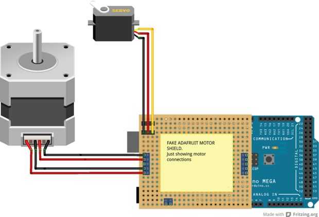 2.1. Conecte el Motor paso a paso a paso a paso de Motor terminal a la izquierda de su pantalla (M1 y M2) y el Servo para el segundo puerto del Servo (ver gráfico)