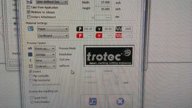 Desea el poder de ser 100, la velocidad a 90 y la frecuencia a 1000. Tenga en cuenta, esto se hace en un láser de TroTec, su configuración puede ser diferente.