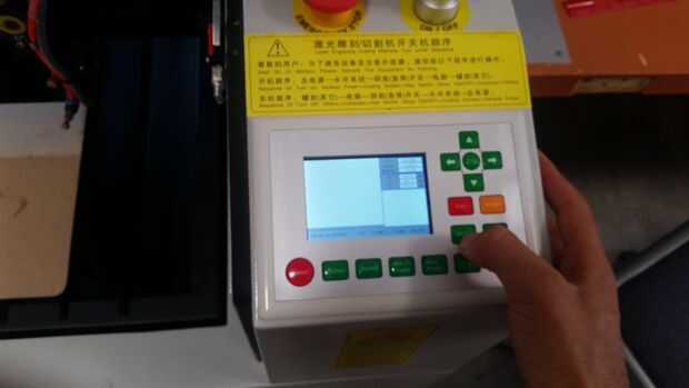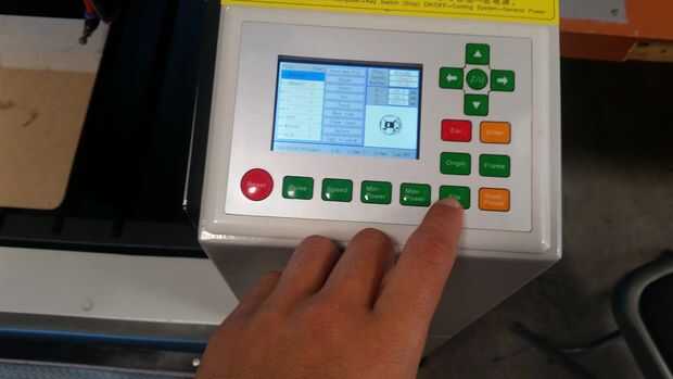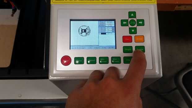 2. Utilice las teclas de flecha para colocar la boquilla del láser en la parte superior derecha de la pieza de trabajo. Utilice el punto láser rojo para la dirección. Luego presione el botón de 'origen'. Esto dice la máquina que ahí es donde está su material, y por lo tanto su espacio de trabajo (del programa)