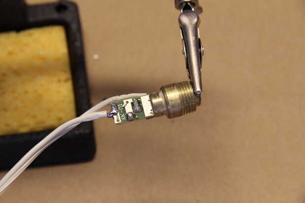 Asegúrese de que se deslice cualquier tubo termocontraíble por que vas a usar sobre los cables del adaptador de CA antes de soldar al láser! Esto le ahorrará algunos frustración más tarde!