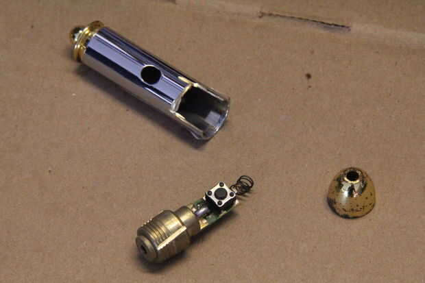 Ahora que tienes agallas de su láser expuestas, puede tomar un vistazo a la placa de circuito. ¿Recuerdas cuando te dije que mirar la orientación de los polos de la batería? Ahora es cuando necesitarás esa información. Para este tutorial, supondré que el terminal positivo de la batería fue ponerse en contacto con chasis metálico del láser y el terminal negativo de la batería en contacto con la placa de circuito del láser. Ajuste como sea necesario para el láser.