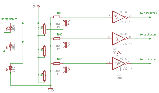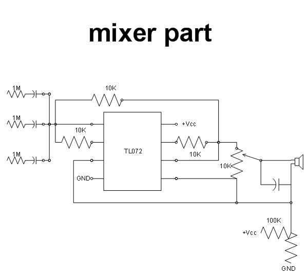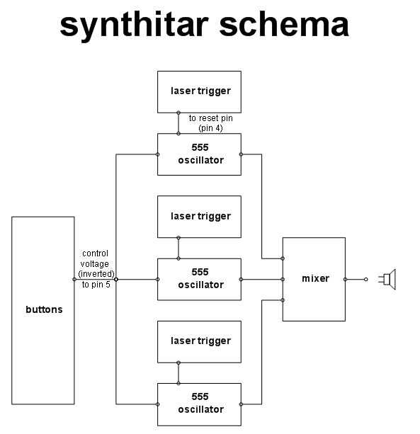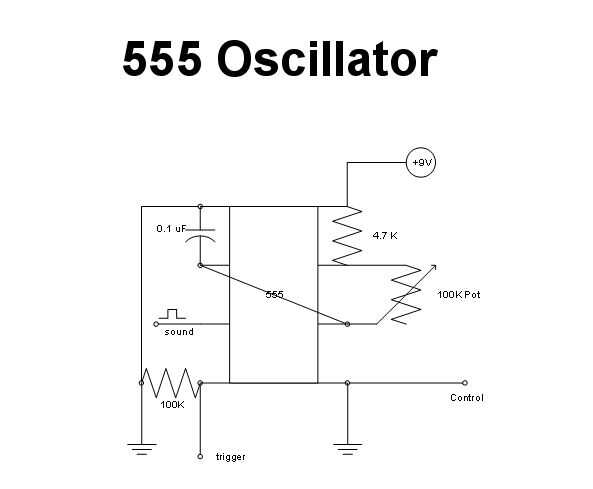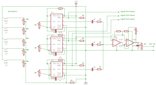 La más simple de lo que parece. Se cablea el 555 como un multivibrador astable. El tono puede ajustarse con el pote de 100K que están conectados con el 555. Los cables de los botones de traste van con el conector de tensión de control. El perno se tira a V + por la resistencia de 10 K y el botón de traste tira de él hacia la tierra, elevar el tono. La cantidad es controlada por el pote de 100K conectado al botón de traste. Así que cada traste puede ajustarse individualmente.