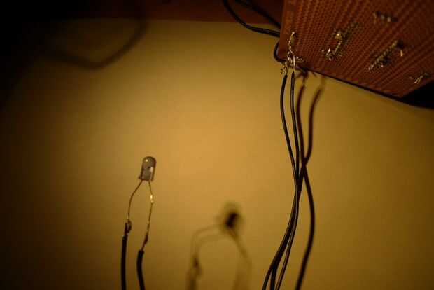 El LED IR está conectado con el emisor del transistor y el resistor de 100 ohm. Entre los conductores son alambres de 8". El plazo de ejecución corto (negativo) va a GND y el cable largo va a la resistencia.