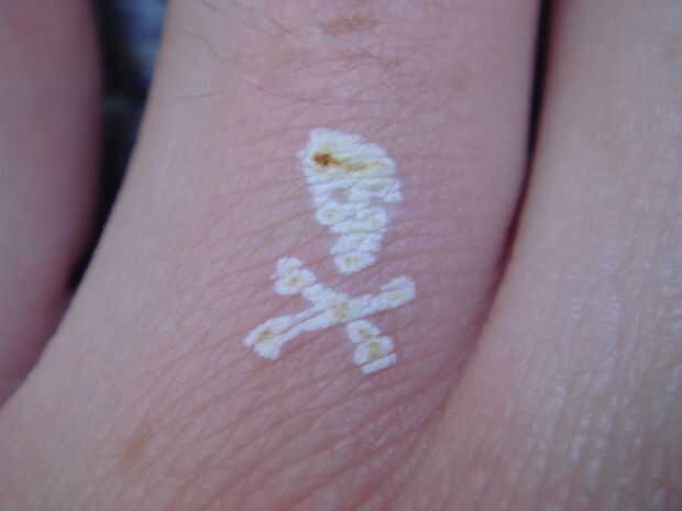 El jolly roger wingdings tatuaje abajo fue hecho usando la energía más alta configuración, y alrededor de 70% la velocidad. Mientras que el dolor era tolerable, se quemó tan profunda, que después de un suave frotamiento de la piel totalmente pelada apagado.