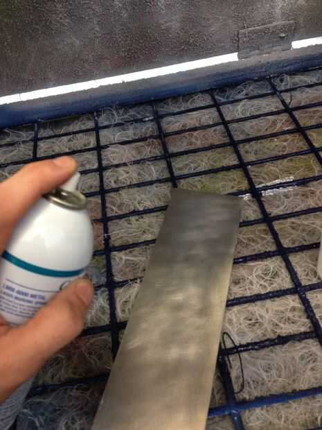 Aerosol, esperar a que la pintura se seque, luego incline el metal a la luz para ver cualquier reflexiones incoherentes, son puntos donde el metal aún está brillando a través.