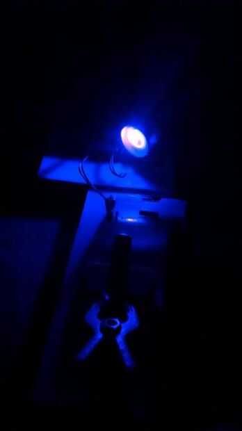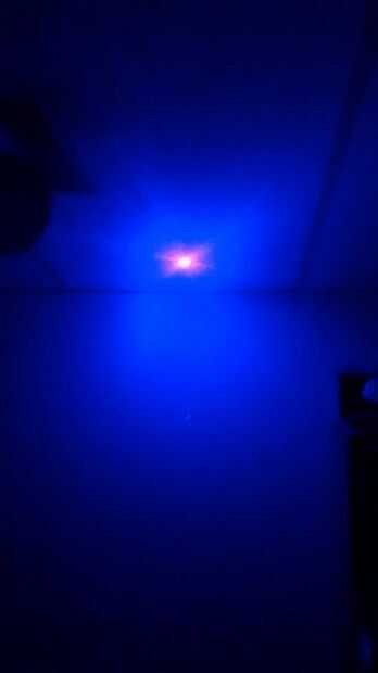 Apagué las luces así que podría hacer que el láser fue dirigido correctamente. La siguiente foto es el láser apuntando a. El círculo grande es cuando enciendo el motor. Y, después de agregar el humo, niebla, vapor, etc... Es una visión que busca obtener en el túnel. La foto 3 es oblonga, porque está golpeando el techo, pero usted consigue la idea!