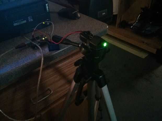 Soldar un cable de cinta a los terminales positivos y negativos del láser. Luego pegamento caliente el láser para el trípode giratorio. Coloque el láser en su protoboard junto con todo lo demás en este diagrama que hice. Usted debe intentarlo primero sin el transistor para que no queme el laser. (Por cierto, la resistencia es un 330Ω)