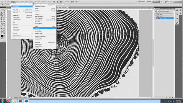 3. hacer que el archivo blanco y negro. Yo también invertida la imagen para hacer los anillos de los árboles negros, pero esto es opcional y depende de qué parte de la imagen que desee al ácido.
