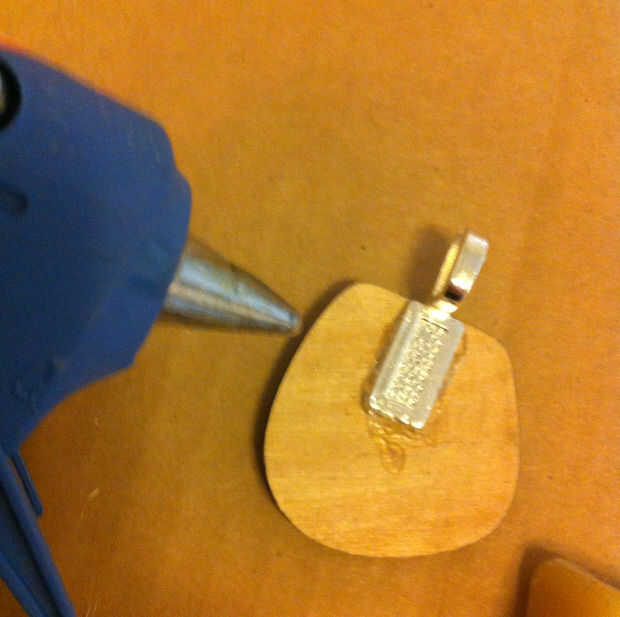 Calentar el pegamento, poner un poco en la parte posterior de la mandíbula inferior y rápidamente (antes de que se enfríe) fíjela a la colgante. En la retrospección deseo que había recibido pequeñas fianzas. Hay algunas hojas de té en forma de los que creo que son más pequeños.