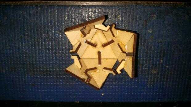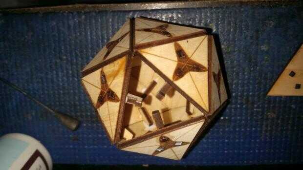 Coloque el último triángulo encima de las articulaciones y el resto del icosaedro para alinear las articulaciones con los agujeros del último triángulo de empuje.