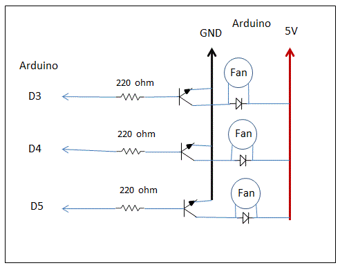 Los motores dibujan demasiada potencia para el Arduino operar directamente, por lo que es necesario un circuito transistor simple del conductor. Los diodos son reducir picos de reversas de los motores del ventilador.