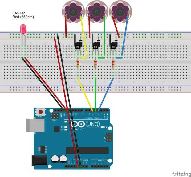 El módulo del laser de Adafruit que usé sólo dibuja sobre la 17ma, lo que es seguro para ejecutar directamente desde un pin del Arduino. Si utiliza una energía más alta, puede que necesite crear un conductor demasiado. Sólo replicar un transistor resistor y reemplace el ventilador/diodo con el diodo láser.