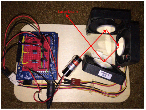 El láser está montado en un tablero pequeño, sobre una media pulgada por encima de la mesa. Ángulo que rebotan en aproximadamente el centro de cada espejo.