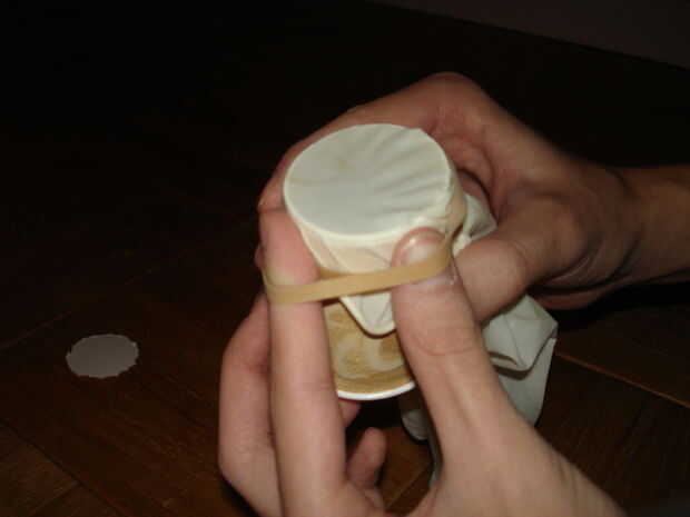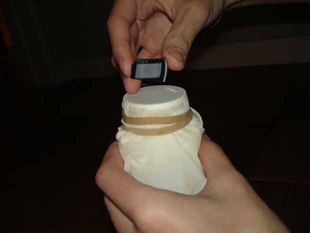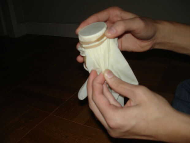 Coloque la palma del guante de látex sobre la abertura que apenas corte y asegure con la cinta de goma.