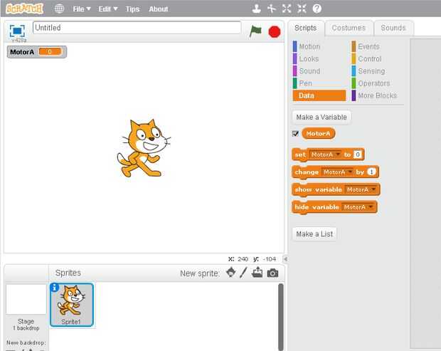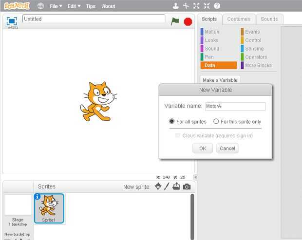 En Kano, abrir la versión Scratchgpio5 de cero. En la versión de Kano de cero, haga clic en Variables (en la versión de web haga clic en datos). Haga clic en el botón "hacer una Variable" y escriba "Engine" en el cuadro (véase el cuadro 1 anterior). Haga clic en el botón "OK" y cero creará todas las variables de control del motor para usted (véase el cuadro 2 anterior).