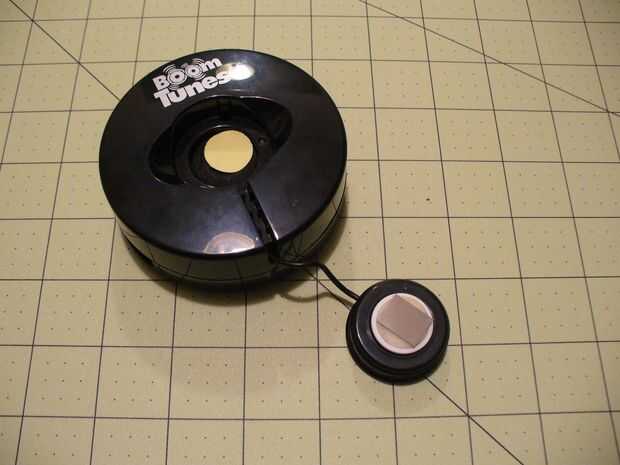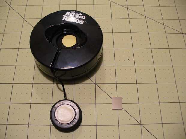 La parte real del altavoz es algo pequeño y fácil de montar por lo que podría rebotar un rayo láser de él. Era una cuestión simple para colocar un pequeño espejo a la parte pegajosa de la bocina Boom Tunes.